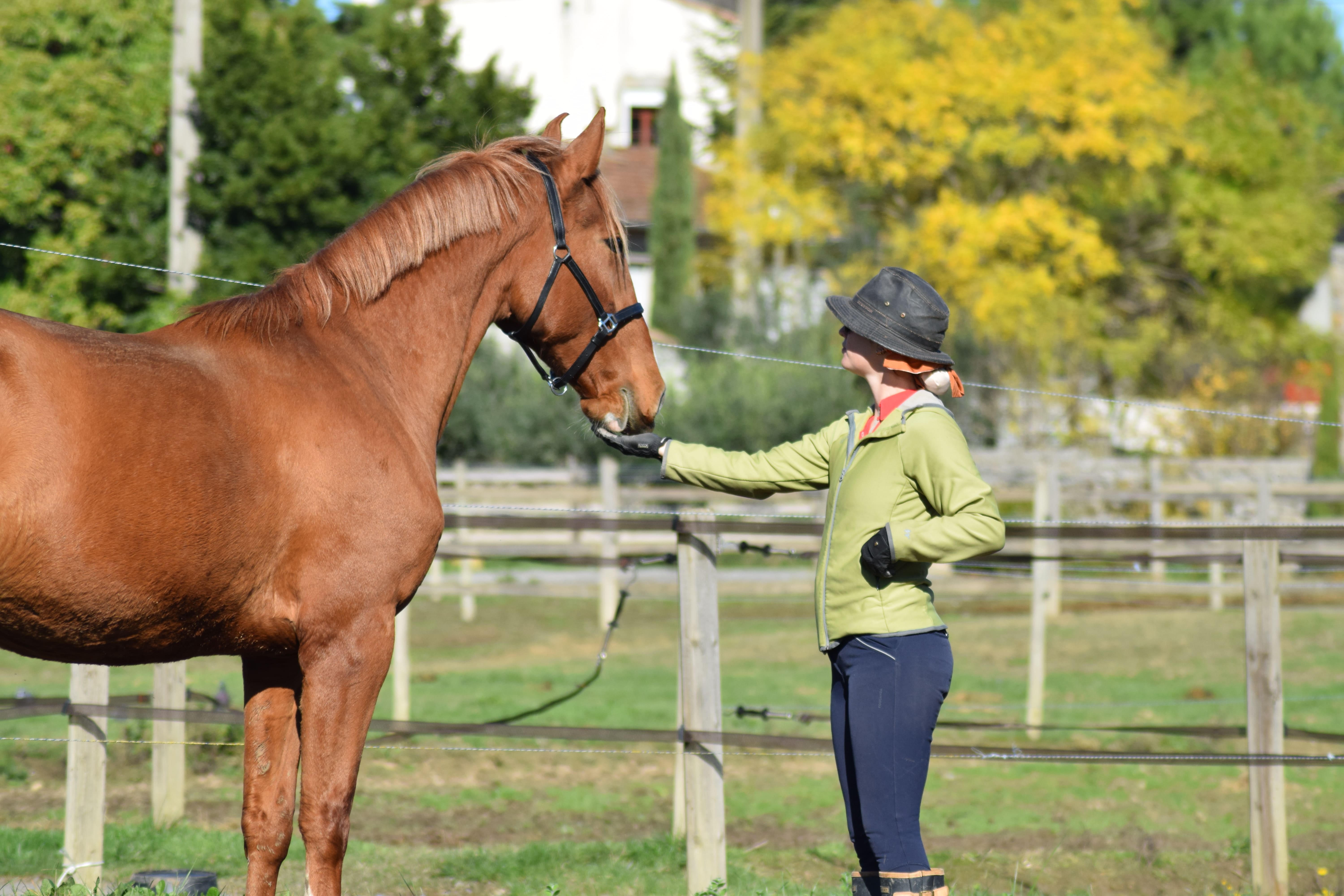 Le travail débute par une familiarisation structurée aux manipulations de base : licolage, soins, conduite en main, embarquement, dans le calme, avec un souci constant du seuil de tolérance et de la gestion du stress.